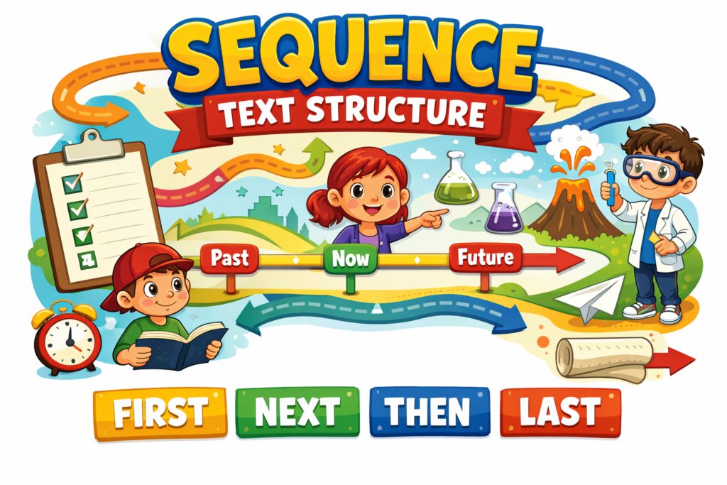 Sequence text structure is the order of events — what happens first, next, and last. It shows up in writing such as directions, timelines, experiments, and how-to texts. When students understand sequence, they can follow steps, retell information accurately, and explain processes without missing or mixing up key details.